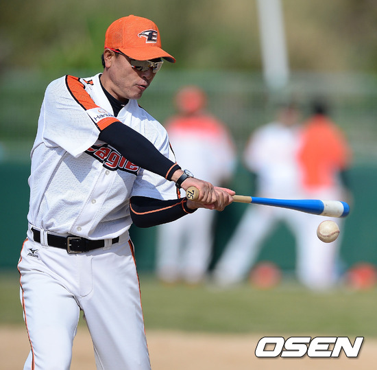 29일 일본 오키나와 고친다 구장에서 진행된 한화 이글스 2013 오키나와 전지훈련에서 한화 송진우 투수코치가 펑고를 치고 있다.