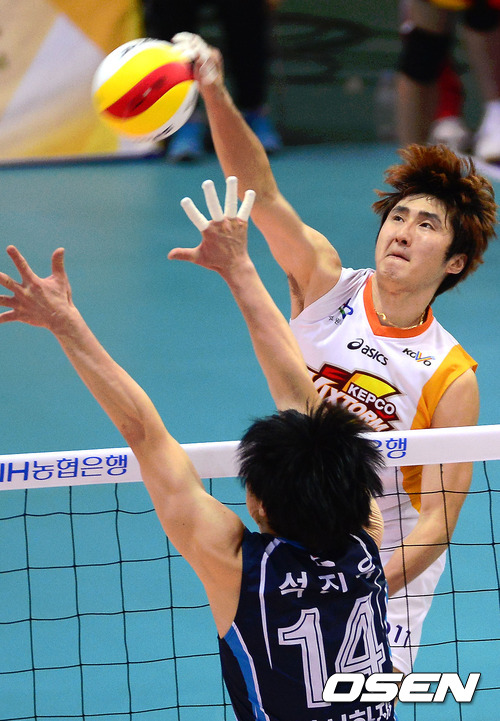 29일 오후 수원 실내체육관에서 열린 '2012-2013 NH농협 V-리그' 남자부 KEPCO와 삼성화재의 경기, 2세트 KEPCO 박성률이 삼성화재 석진욱의 블로킹을 피해 스파이크를 때리고 있다.