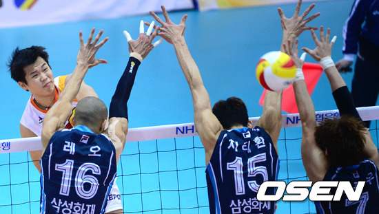 29일 오후 수원 실내체육관에서 열린 '2012-2013 NH농협 V-리그' 남자부 KEPCO와 삼성화재의 경기, 2세트 KEPCO 서재덕이 삼성화재 레오, 지태환, 유광우의 블로킹을 피해 득점을 올리고 있다.