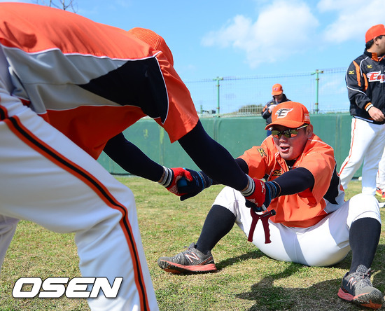 29일 일본 오키나와 고친다 구장에서 진행된 한화 이글스 2013 오키나와 전지훈련에서 한화 송창식이 조정희 코치와 스트레칭을 하고 있다.