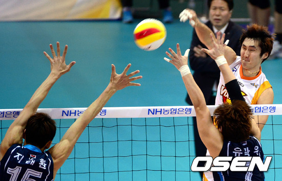 29일 오후 수원 실내체육관에서 열린 '2012-2013 NH농협 V-리그' 남자부 KEPCO와 삼성화재의 경기, 2세트 KEPCO 박성률이 삼성화재 지태환, 유광우의 블로킹을 뚫고 득점을 올리고 있다.