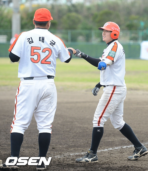 29일 일본 오키나와 고친다 구장에서 진행된 한화 이글스 2013 오키나와 전지훈련에서 라이브게임 중 오선진이 안타를 날린 후 1루에서 1루수 김태균과 하이파이브를 하고 있다.