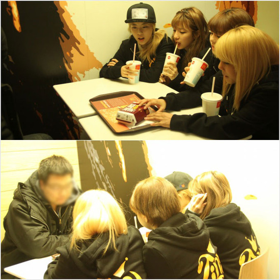30일 오전 타이니지 공식 트위터에는 매니저와 함께 패스트푸드점에서 식사 중인 타이니지 멤버들의 모습이 공개되었다.