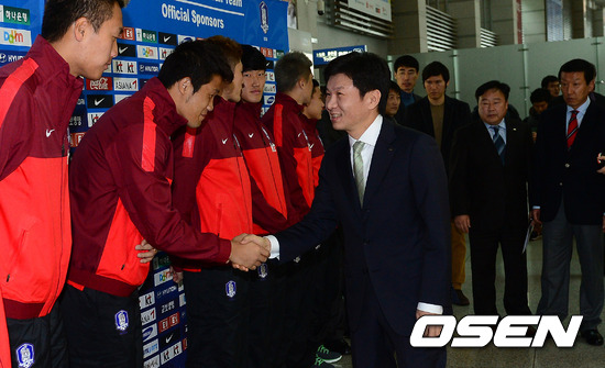 정몽규 회장이 대표팀 선수들을 격려하고 있다.