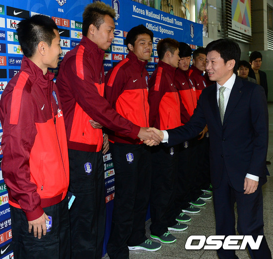 정몽규 회장이 대표팀 선수들과 악수를 하며 격려하고 있다.