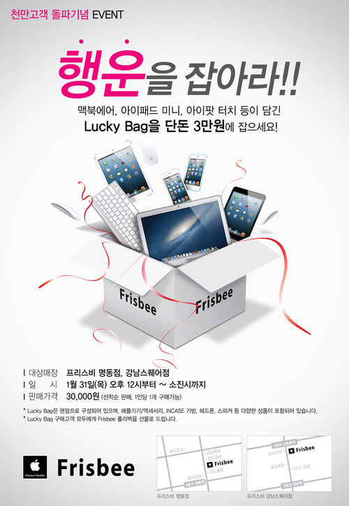 맥북에어, 아이패드 미니, 아이팟 터치 등 애플 정품을 비롯해 스피커, 헤드폰과 같은 애플 액세서리가 무작위로 담겨 있는 럭키백은 3만 원에 판매된다. 이벤트는 선착순으로 내방한 고객이 매장에 비치된 추첨박스에서 번호가 부여된 USB를 선택하면 해당 번호에 일치하는 럭키백을 즉석에서 증정하는 방식으로 열린다.