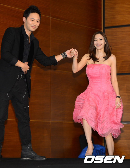 30일 오후 서울 여의도 콘래드 서울 호텔에서 진행된 KBS 2TV 새 월화드라마 ‘광고천재 이태백’ 제작발표회에서 배우 진구가 한채영의 손을 잡아주며 에스코트 하고 있다