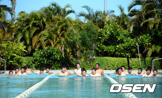 30일 오후(현지시간) 괌에 위치한 삼성 1차 전지훈련장에서 투수들이 수영 훈련을 하고 있다.
