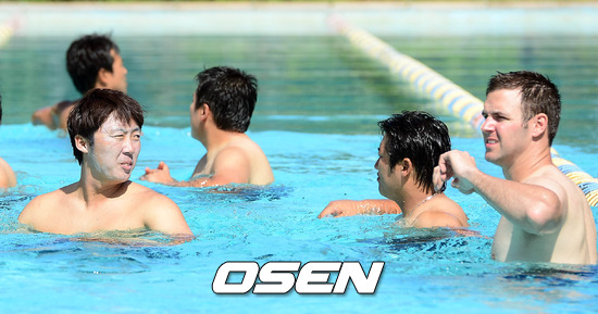 30일 오후(현지시간) 괌에 위치한 삼성 1차 전지훈련장에서 배영수와 밴덴헐크가 수영 훈련을 하고 있다.