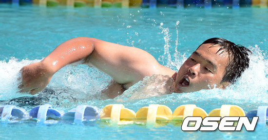 30일 오후(현지시간) 괌에 위치한 삼성 1차 전지훈련장에서 김기태가 수영 훈련을 하고 있다.
