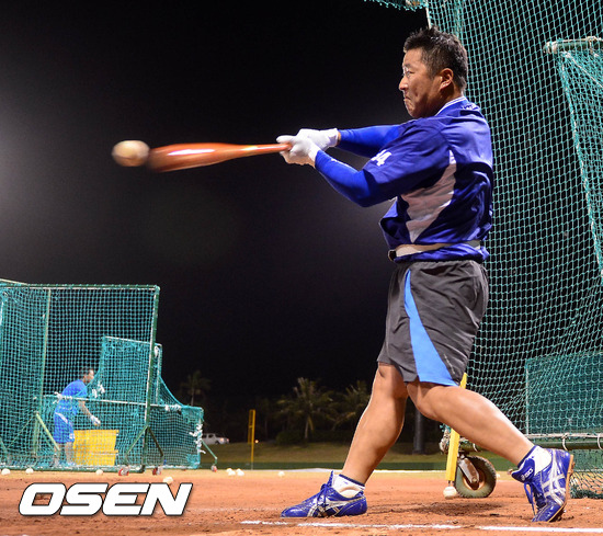 30일 밤(현지시간) 괌에 위치한 삼성 1차 전지훈련장에서 최형우가 타격훈련을 하고 있다.