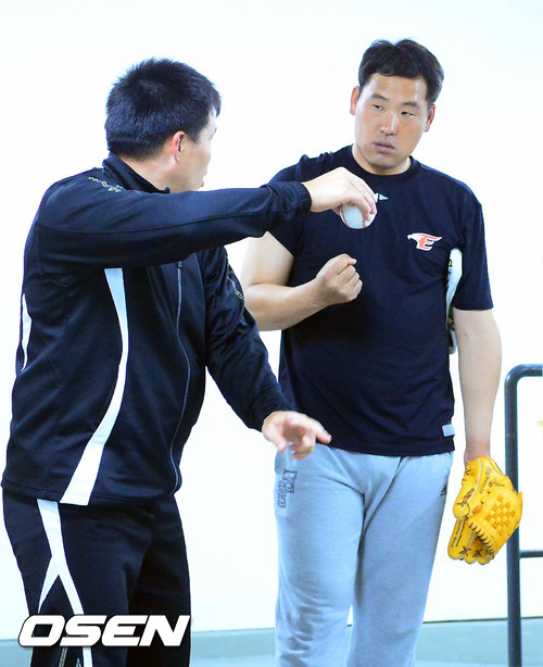 한화 마일영과 김일엽이 투구 폼에 대해 얘기를 나누고 있다.