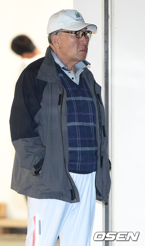 한화 김응룡 감독이 투수들의 쉐도우(섀도) 피칭을 주시하고 있다.