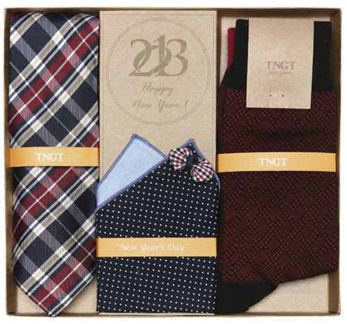 TNGT의 선물 패키지는 정장 차림이나 비즈니스 캐주얼에 함께 코디할 수 있는 넥타이, 행커치프, 양말, 부토니에 등 총 4개의 아이템으로 구성된 실속 있는 선물세트이다.