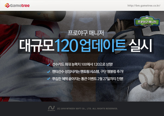 엔트리브소프트가 프로야구단 운영 시뮬레이션 게임 '프로야구 매니저'의 2013년 첫 대규모 업데이트 '120'을 31일 진행한다고 밝혔다.