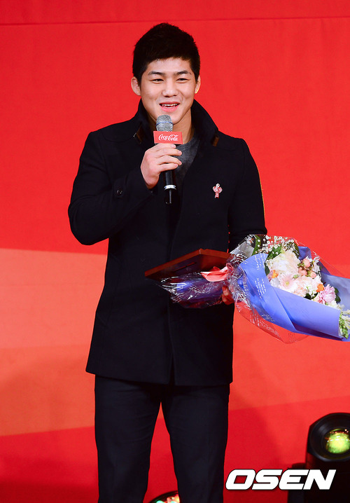 31일 서울 한남동 글랜드 하얏트에서 열린 '제18회 코카콜라 체육대상' 시상식에서 신인상을 수상한 김현우가 소감을 말하고 있다.