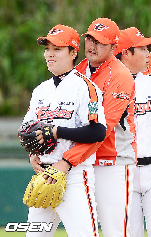 31일 일본 오키나와 고친다 구장에서 진행된 한화 이글스 2013 오키나와 전지훈련에서 안승민이 정민혁의 뒤에서 백허그를 하고 있다.