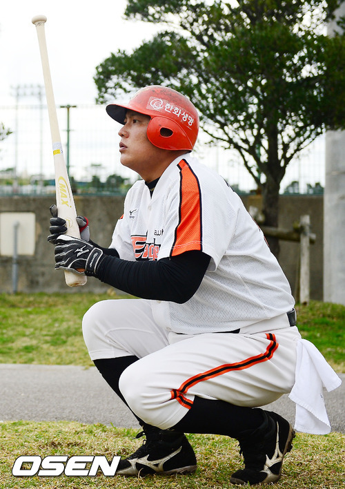 29일 일본 오키나와 고친다 구장에서 진행된 한화 이글스 2013 오키나와 전지훈련에서 김태균이 배트를 들고 오리걸음을 하고 있다.