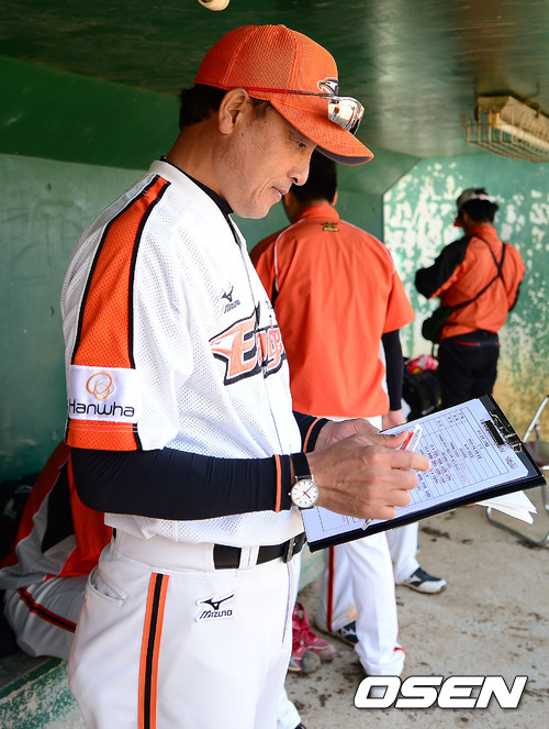 29일 일본 오키나와 고친다 구장에서 진행된 한화 이글스 2013 오키나와 전지훈련에서 송진우 투수코치가 훈련상황을 기록하고 있다.