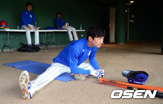 31일 오전(현지시간) 괌에 위치한 레오팔레스 삼성 1차 전지훈련장에서 강명구가 락커룸 앞에서 스트레칭을 하고 있다.