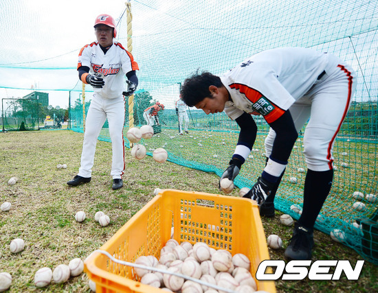 29일 일본 오키나와 고친다 구장에서 진행된 한화 이글스 2013 오키나와 전지훈련에서 임익준과 추승우가 공을 담고 있다.