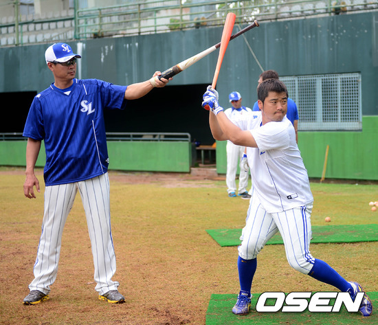 31일 오전(현지시간) 괌에 위치한 레오팔레스 삼성 1차 전지훈련장에서 박석민이 김한수 코치의 지도를 받으며 훈련을 하고 있다.