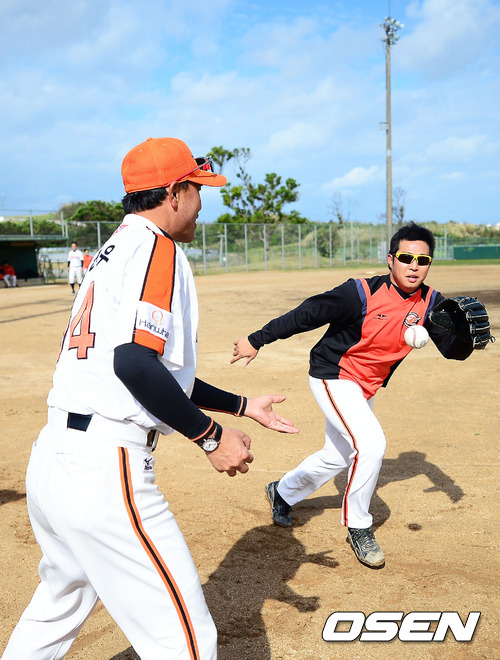 29일 일본 오키나와 고친다 구장에서 진행된 한화 이글스 2013 오키나와 전지훈련에서 송진우 투수코치가 투수들에게 계속 공을 던지며 수비훈련을 시키고 있다.