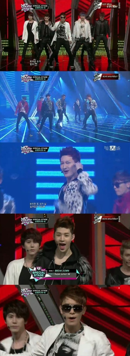 슈퍼주니어-M은 31일 오후 6시 방송된 엠넷 '엠카운트다운'에 출연해 신곡 '고(GO)'와 '브레이크다운(Break down)'을 열창했다.