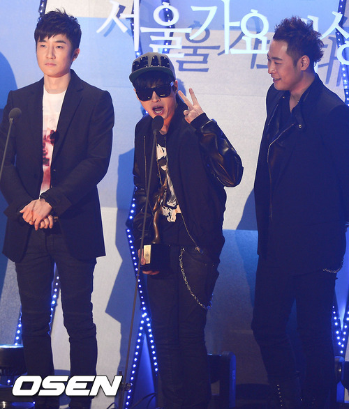 31일 오후 서울 송파구 방이동 SK올림픽핸드볼경기장에서 열린 '제22회 하이원 서울가요대상' (2012 Seoul Music Awards) 시상식에서 에픽하이가 본상을 수상한 뒤 소감을 말하고 있다