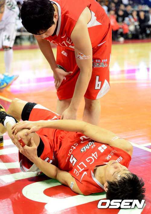 2쿼터 SK 김선형이 동부 센슬리의 파울에 코트에 넘어지며 무릎을 부여잡고 있다.