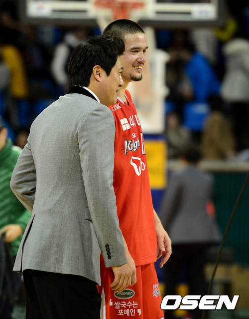 경기후 승리한 SK 문경은 감독이 더블더블을 기록한 김민수의 활약에 기뻐하고 있다. /jpnews@osen.co.k