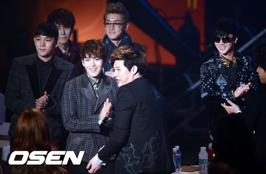 31일 오후 서울 송파구 방이동 SK올림픽핸드볼경기장에서 열린 '제22회 하이원 서울가요대상' (2012 Seoul Music Awards) 시상식에서 한류특별상을 수상한 슈퍼주니어가 동료들의 축하를 받고 있다