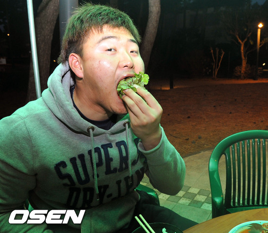 오재일이 한입에 고기쌈을 먹고 있다.