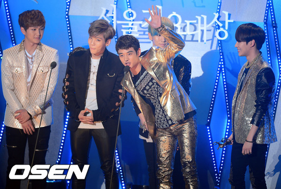 31일 오후 서울 송파구 방이동 SK올림픽핸드볼경기장에서 열린 '제22회 하이원 서울가요대상' (2012 Seoul Music Awards) 시상식에서 하이원인기상을 수상한 샤이니가 소감을 말하고 있다