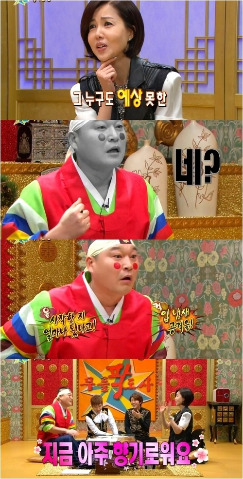강호동은 크게 당황하며 “입냄새 공격하는 것이냐”고 겨우 응수했다. 백지연은 그제서야 “아주 분위기가 좋다. 향기롭다”고 해명했다.