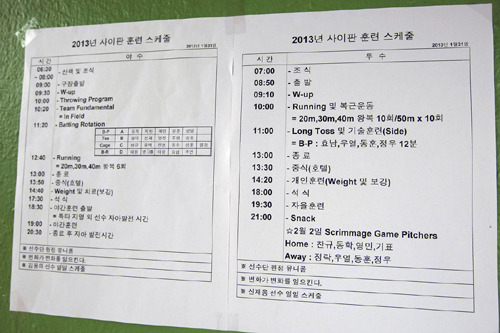 훈련 스케줄표 하단에는 이날 스케줄을 짠 선수 코치의 명단과 함께 ‘변화가 변화를 일으킨다’는 격문이 눈에 띈다. 지난 10년간 포스트시즌에 진출하지 못해 애를 태우고 있는 LG의 절박한 심정이 엿보이는 문구이다. 대변화를 꾀해서 새바람을 일으키겠다는 김기태 감독의 의지의 표현이기도 하다.