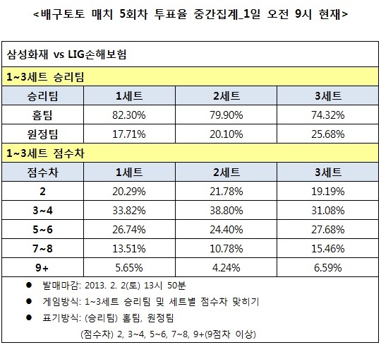 [배구토토] 국민체육진흥공단(www.kspo.or.kr)이 발행하는 체육진흥투표권 수탁사업자인 스포츠토토의 공식 온라인 발매사이트 베트맨(www.betman.co.kr)은 오는 2일 오후 2시 대전충무체육관에서 펼쳐지는 삼성화재-LIG전을 대상으로 하는 배구토토 매치 5회차 게임 투표율 중간집계 결과, 배구팬들은 리그 1위 삼성화재(16승 3패, 승점 : 46)이 리그 4위 LIG(10승 9패 승점 31점)에 우세한 경기를 펼칠 것으로 예상했다.