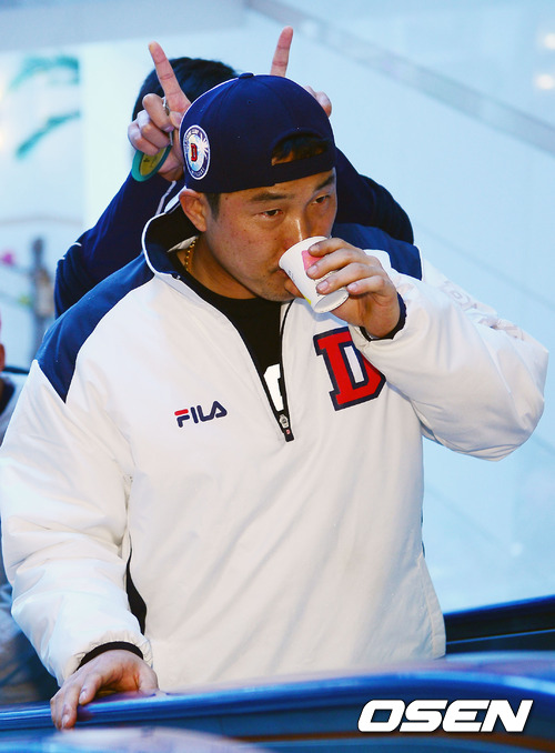 두산 김동주가 에스컬레이터를 타며 커피를 마시고 있다.