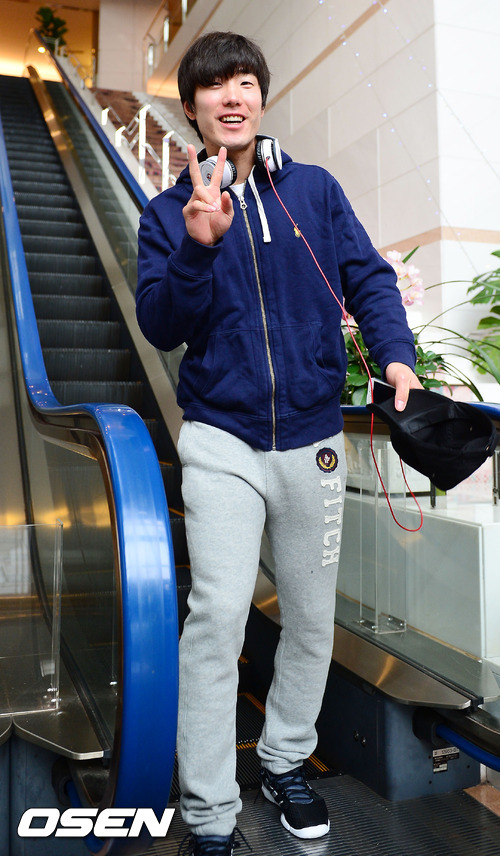 두산 김재호가 숙소를 나오며 취재진을 향해 포즈를 취하고 있다.
