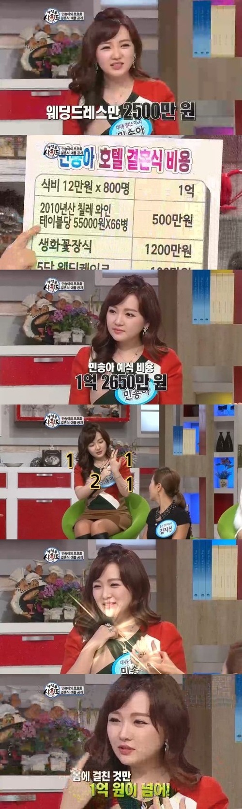 이어 민송아는 결혼식 비용과 내용을 세세히 공개했다. 결혼식은 총 2부로 나눠 1부는 기독교 예배식, 2부는 축하 가수단과 마술쇼, 비보이 공연까지 했다. 웨딩드레스와 예물을 제외하고 결혼식 비용만 1억 3천여만원이 들었다.