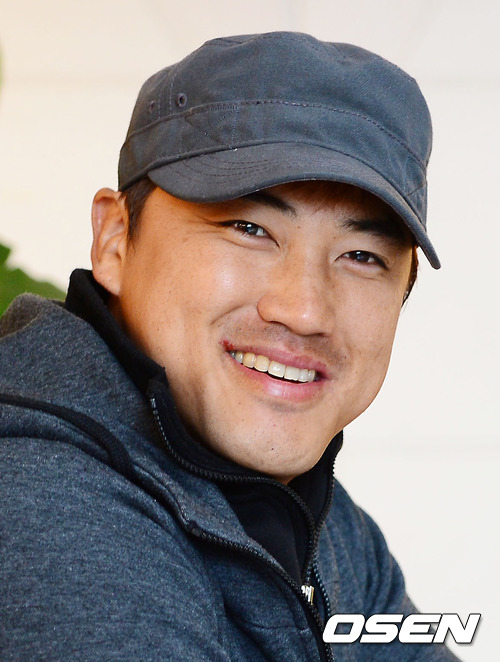 두산 홍성흔이 숙소 로비에서 환하게 미소짓고 있다.