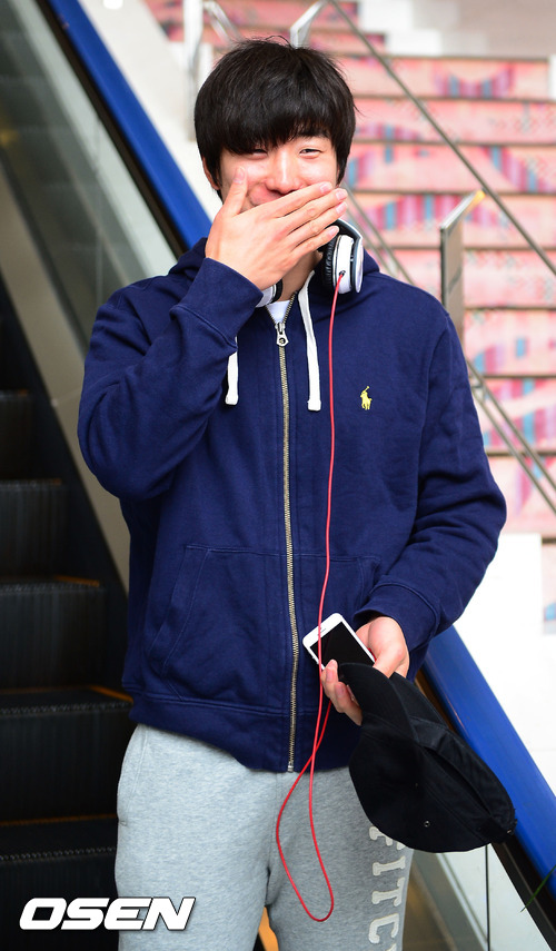 두산 김재호가 숙소를 나오며 취재진을 발견하고 미소짓고 있다.