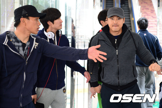 두산 이종욱이 로비에서 홍성흔을 안내하고 있다.