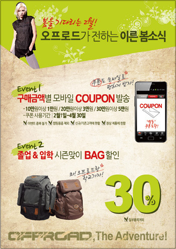 캠핑웨어 브랜드 ‘오프로드’가 소비자사은행사의 일환으로 ‘구매금액별 모바일 쿠폰 발송’ 및 ‘가방 30% 할인’ 이벤트를 진행한다.