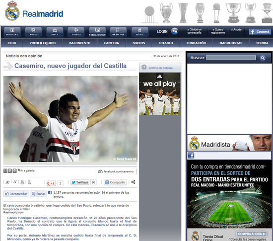 레알 마드리드가 브라질의 유망주 미드필더 카세미루(21)를 영입했다.