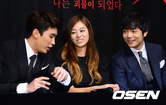 1일 오후 서울 호암아트홀에서 진행된 JTBC 새 일일드라마 '가시꽃'(감독 김도형 / 극본 이홍구) 제작발표회에서 배우 강경준과 장신영, 서도영이 이야기를 나누고 있다