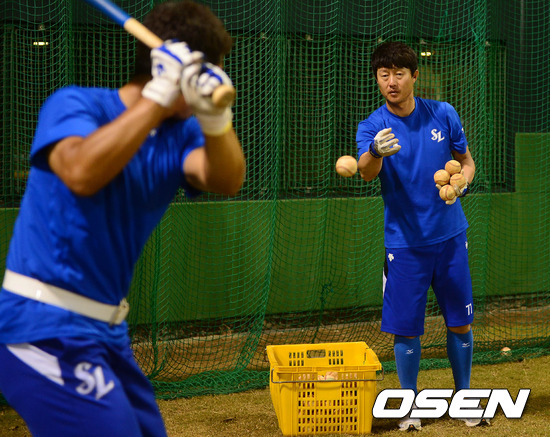 훈련 휴식일인 1일 밤(현지시간) 괌에 위치한 레오팔레스 삼성 1차 전지훈련장에서 김종훈 코치가 선수들의 타격 훈련을 돕고 있다.
