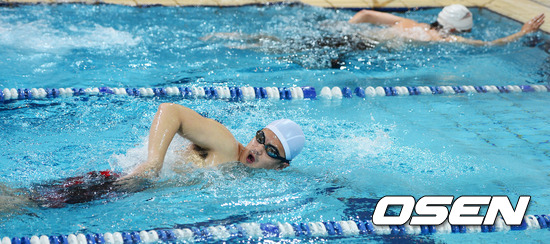 두산 김명성과 김상현이 선수단 숙소 라구제 히토츠바의 수영장에서 수영을 하고 있다.