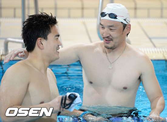 두산 김상현과 김명성이 선수단 숙소 라구제 히토츠바의 수영장에서 즐거운 시간을 보내고 있다.