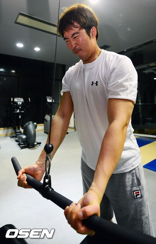 두산 오현근이 선수단 숙소 라구제 히토츠바의 웨이트장에서 훈련을 하고 있다.
